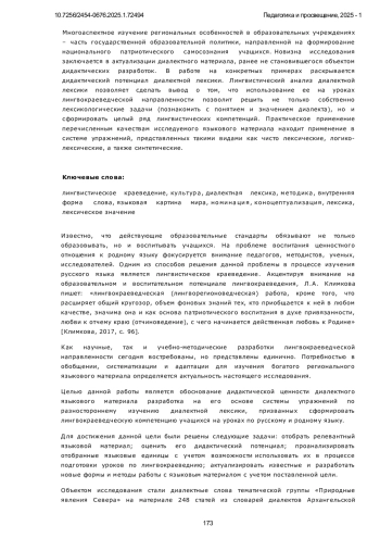Предметом данного исследования является дидактический потенциал диалектной лексики, возможность ее использования на уроках русского языка. Диалектный языковой материале материал позволяет учащимся освоить такие языковые явления как взаимосвязь внутренней формы и лексического значения слова; системность лексики, системные связи слов. Используя диалектную лексику, мы имеем возможность демонстрировать: взаимосвязь внутренней формы и лексического значения слова, системность лексики, системные связи слов; связь между реалиями действительности, их восприятием, мышлением и языком; процессы концептуализации действительности; процессы номинации; богатство языка (диалекты - часть национального, литературно языка, их отношение); самобытность края в зеркале языка; использовать связь лексики с другими уровнями языка, в первую очередь, с морфемикой и словообразованием. При подготовке данной работы использовались следующие методы: наблюдение, классификация, моделирование, интерпретация. Основным лингвистическим методом стал структурно-семантический анализ. Многоаспектное изучение региональных особенностей в образовательных учреждениях - часть государственной образовательной политики, направленной на формирование национального патриотического самосознания учащихся. Новизна исследования заключается в актуализации диалектного материала, ранее не становившегося объектом дидактических разработок. В работе на конкретных примерах раскрывается дидактический потенциал диалектной лексики. Лингвистический анализ диалектной лексики позволяет сделать вывод о том, что использование ее на уроках лингвокраеведческой направленности позволит решить не только собственно лексикологические задачи (познакомить с понятием и значением диалекта), но и сформировать целый ряд лингвистических компетенций. Практическое применение перечисленным качествам исследуемого языкового материала находит применение в системе упражнений, представленных такими видами как чисто лексические, логико-лексические, а также синтетические.