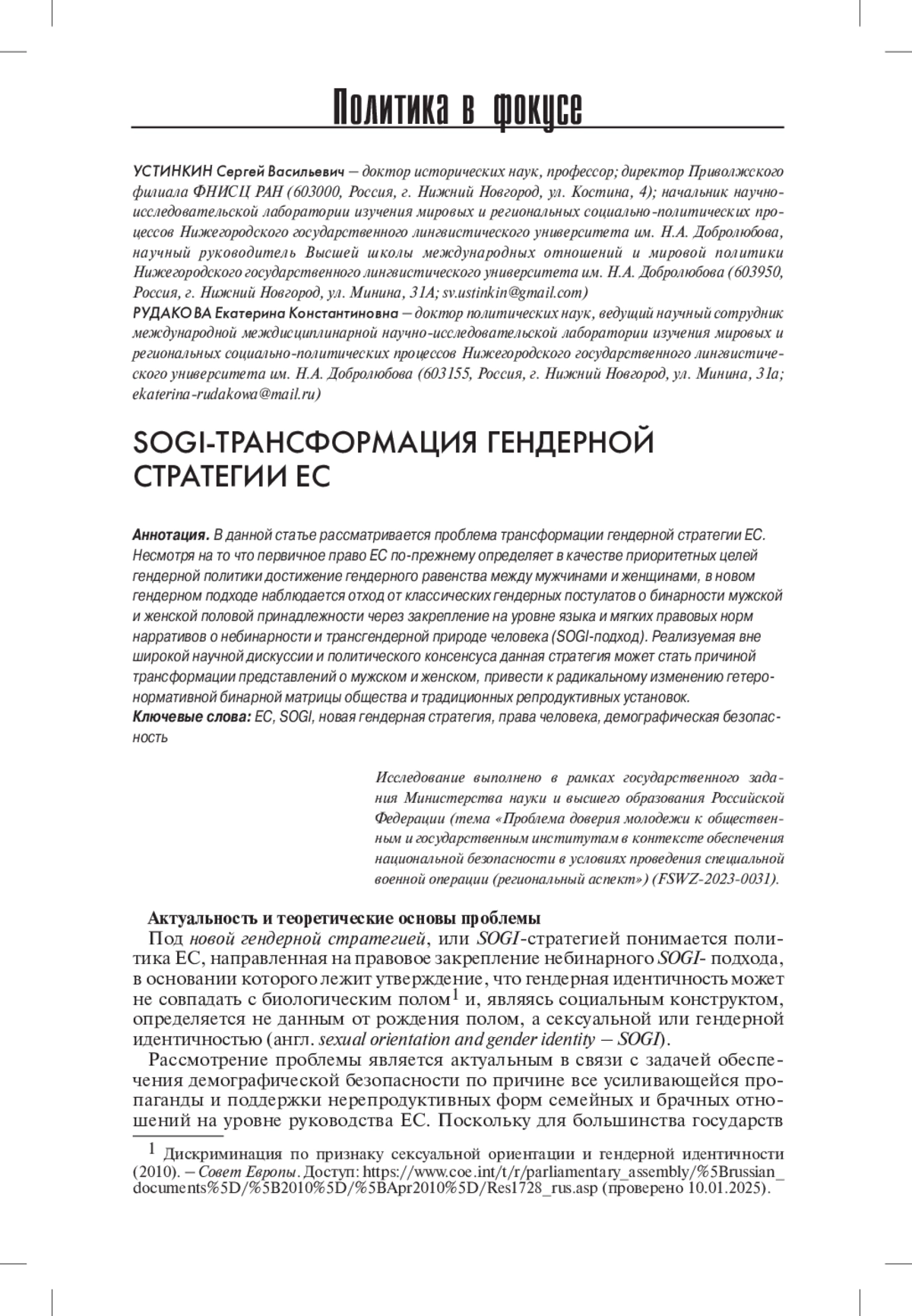 УСТИНКИН С. В., ГАЙКОВИЧ Е. К. SOGI-ТРАНСФОРМАЦИЯ ГЕНДЕРНОЙ СТРАТЕГИИ ЕС // ВЛАСТЬ. 2025. ТОМ 33 № 1