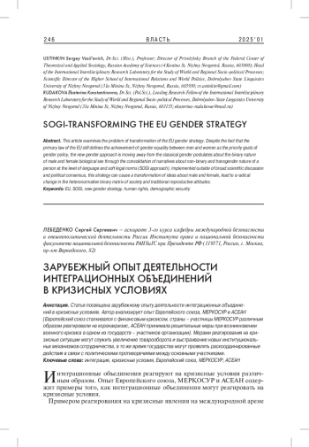 В данной статье рассматривается проблема трансформации гендерной стратегии ЕС. Несмотря на то что первичное право ЕС по-прежнему определяет в качестве приоритетных целей гендерной политики достижение гендерного равенства между мужчинами и женщинами, в новом гендерном подходе наблюдается отход от классических гендерных постулатов о бинарности мужской и женской половой принадлежности через закрепление на уровне языка и мягких правовых норм нарративов о небинарности и трансгендерной природе человека (SOGI-подход). Реализуемая вне широкой научной дискуссии и политического консенсуса данная стратегия может стать причиной трансформации представлений о мужском и женском, привести к радикальному изменению гетеронормативной бинарной матрицы общества и традиционных репродуктивных установок.