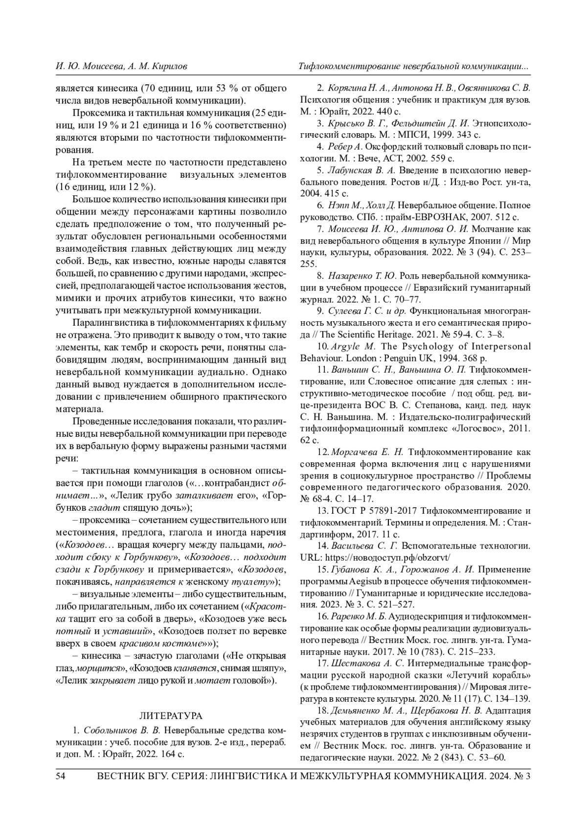 Исследование посвящено анализу невербального аспекта общения, вербализованного в виде звуковых тифлокомментариев. Материалом исследования послужил художественный фильм режиссера Леонида Гайдая «Бриллиантовая рука» с тифлокомментированием. Выбрано 85 фрагментов, в которых при помощи вербальных средств передачи информации описаны невербальные аспекты коммуникации. Работа выдержана в русле междисциплинарного, функционального и деятельностного подходов, предусматривающих системный учет стороны говорящего и слушающего, а также коммуникативные потребности говорящего и данного языкового сообщества. Авторы освещают различные подходы к изучению вопросов невербальной коммуникации и тифлокомментирования, определяют основные критерии классификаций видов невербальной коммуникации, демонстрируют виды и различные методы тифлокомментирования. В статье разработан алгоритм исследования невербального аспекта общения, вербализованного в виде звуковых тифлокомментариев, включающий следующие этапы: составление списка тифлокомментариев с соответствующими им таймкодами, упорядоченный хронологически; классификация тифлокомментариев по видам невербальной коммуникации (кинесика, проксемика, тактильная коммуникация, паралингвистика, визуальные элементы); обоснование применения тифлокомментариев в определенной ситуации невербального общения; количественный анализ использования тифлокомментирования в зависимости от вида невербальной коммуникации; анализ частей речи, вербализующих различные виды невербальной коммуникации. Анализ показал, что наиболее частотным видом невербального общения, к которому применено тифлокомментирование, является кинесика. На втором месте по частотности тифлокомментирования - проксемика и тактильная коммуникация. На третьем месте по частотности представлено тифлокомментирование визуальных элементов. Тифлокоментирование паралингвистического вида невербальной коммуникации не зарегистрировано. Авторы пришли к выводу о том, что тифлокомментирование различных видов невербальной коммуникации характеризуется использованием различных частей речи. Полученные знания могут быть применены в области межкультурной коммуникации с целью разработки эффективной стратегии грамотного взаимодействия и общения. Сведения о количественном распределении тифлокомментариев в зависимости от вида невербальной коммуникации могут использоваться для лучшей адаптации аудиовизуального произведения к перцептивным возможностям человека с нарушенным зрением.
