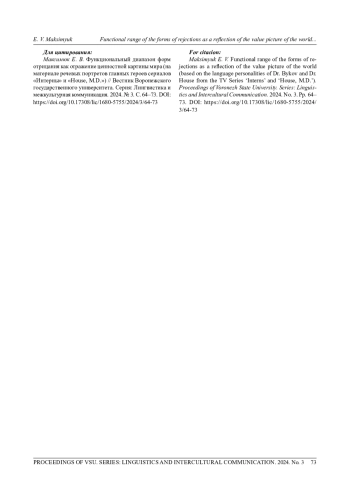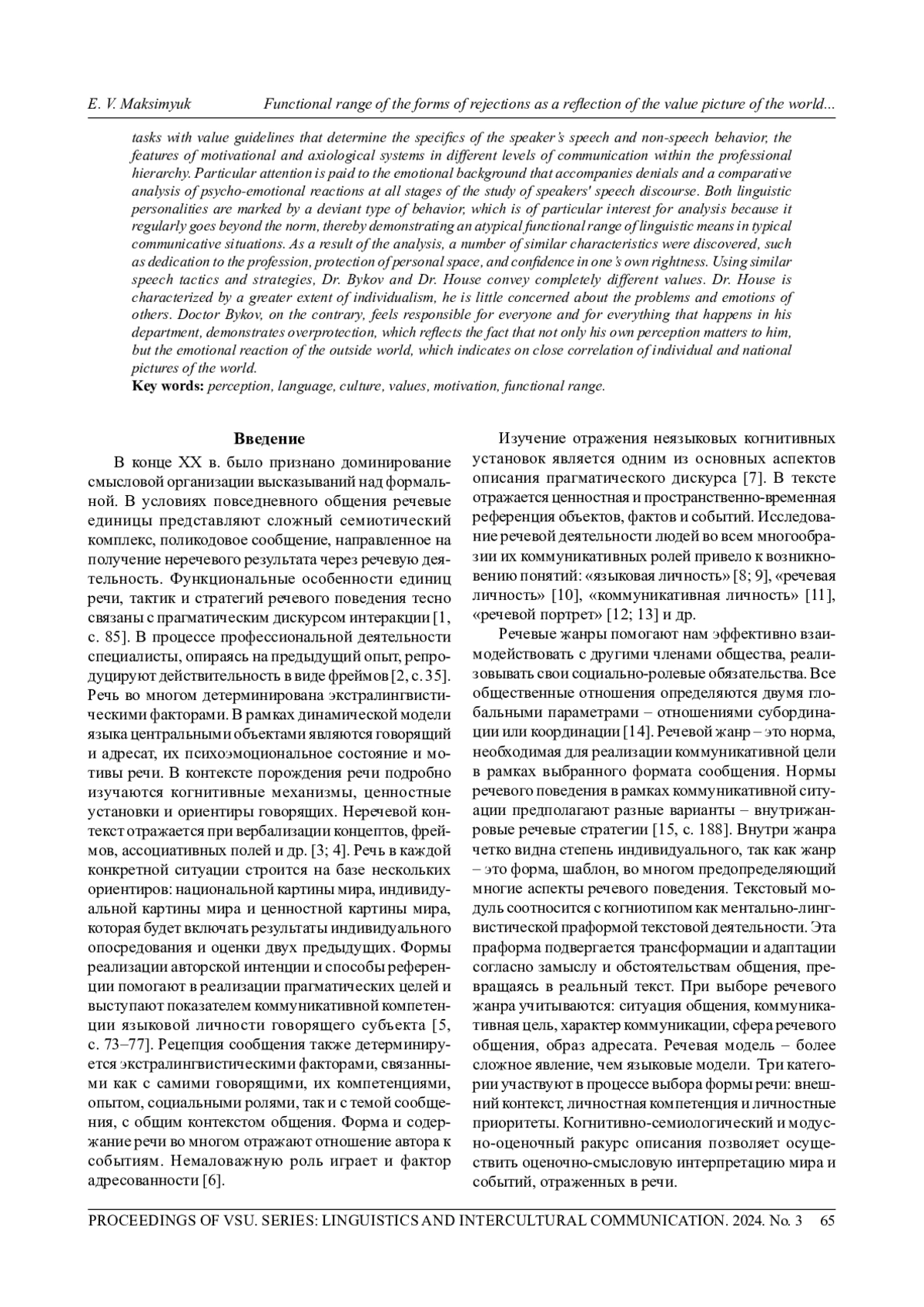 Статья отражает результаты анализа профессионально-ориентированного речевого дискурса двух языковых личностей из разных социокультурных сред, но имеющих схожее образование и профессию. Анализ был направлен на выявление интегральных и дифференциальных признаков внутри фрагментов ценностной картины мира разных стран, ценностных доминант, детерминирующих речевое поведение данных языковых личностей. Сравнительный анализ высказываний, эксплицитно или имплицитно содержащих отрицания в рамках диалогических единиц, позволил нам описать функциональный диапазон речевых тактик и стратегий, соотношение задач прагматического характера с ценностными ориентирами, которые детерминируют специфику речевого и неречевого поведения говорящего, особенности мотивационной и аксиологической систем на разных уровнях общения в рамках профессиональной иерархии. Особое внимание уделяется эмоциональному фону, сопровождающему отрицания, и сравнительному анализу психоэмоциональных реакций на всех этапах исследования речевого дискурса говорящих. Для анализируемых личностей характерен девиантный тип поведения, интересный для анализа тем, что регулярно выходит за рамки нормы, тем самым демонстрирует нетипичный функциональный диапазон языковых средств в типичных коммуникативных ситуациях. В результате анализа был обнаружен ряд общих характеристик, таких как преданность профессии, защита личного пространства, уверенность в собственной правоте. Прибегая к схожим речевым тактикам и стратегиям, доктор Быков и доктор Хаус транслируют совершенно разные ценности. Доктору Хаусу присущ в большей степени индивидуализм, его мало волнуют проблемы и эмоции других. Доктор Быков, наоборот, ощущает ответственность за всех и за все, что происходит в его отделении, для него имеет значение не только собственная рефлексия, но рецепция внешнего мира, что свидетельствует о тесной корреляции индивидуальной и национальной картин мира.