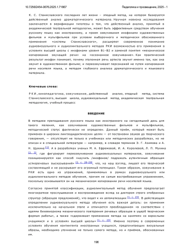 В статье представлены возможности интеграции действенного анализа, принятого в академической театральной методологии, и его главной составляющей - этюдного метода - в практику РКИ. Автор предлагает качественно новый уровень озвучивания инофонами художественных фильмов и мультфильмов, основанный на понимании природы конфликта каждой сцены, предлагаемых обстоятельств, психологии взаимоотношений персонажей, их характеров, мотивов, сверхзадачи. Обозначенные положения стали предметом исследования авторской программы «Я понимаю!», прошедшей апробацию в 6 вузах России и КНР. В статье представлены алгоритмы работы программы, а также варианты заданий и разборов на примере рассмотренного в учебнике «Я понимаю!» фильма Олега Янковского по мотивам пьесы Надежды Птушкиной «Приходи на меня посмотреть». В статье рассматриваются возможности применения основных положений «системы Станиславского» на уроках русского языка как иностранного в ходе работы со студентами-инофонами уровня В1-В2 над озвучиванием художественных фильмов и мультфильмов. За основу взято изобретение К. С. Станиславского последних лет жизни - этюдный метод, на котором базируется действенный анализ драматургического материала. Научная новизна исследования заключается в верификации гипотезы о том, что действенный анализ, принятый в академической театральной методологии, может быть эффективным средством обучения русскому языку как иностранному, а прием озвучивания инофонами художественных фильмов и мультфильмов при условии выборочного и методически обоснованного применения «системы Станиславского», расширяет современное понимание аудиовизуального и аудиолингвального методов РКИ возможностью его применения в условиях высшей школы с инофонами уровня В1-В2 и заменой понятия «механическое копирование звучащей речи» на «осознанное озвучивание». Как практический результат инофон понимает, почему эталонная речь артиста звучит именно так, как она звучит в художественном фильме; и переозвучивает персонажей не путем копирования речи носителя языка, а методом глубокого анализа драматургического и языкового материала.