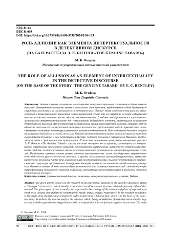 Данная статья посвящена исследованию интертекстуальных элементов в детективном дискурсе. Интертекстуальность, являясь «диалогом» двух текстов, представляет собой двуплановую структуру, разделяясь на материальную и тематическую. Данные типы интертекстуальности выражаются в заимствованиях элементов плана выражения (слово или его вариант) и плана содержания текста (сюжеты, мотивы, темы, образы) соответственно. В работе мы обращаемся к изучению тематической интертекстуальности для установления библейского сюжета, являющегося основанием детективного рассказа. Для достижения поставленной задачи анализируется аллюзия, которая, будучи одним из показателей материальной интертекстуальности, представляет собой скрытый тип заимствования элементов, по которым реципиент узнает исходный текст. В исследовании делается акцент на выявление библейских аллюзий, поскольку Библейский текст является самым используемым претекстом в европейской культуре, и сам детективный дискурс, содержа отсылки к Священному Писанию, предполагает связь с христианскими ценностями. В качестве источника материала выступает рассказ Э. К. Бентли «The Genuine Tabard». Анализ рассказа построен по алгоритму, состоящему из четырех шагов: определение библейского сюжета; сопоставление характерных черт героев; установление языковых средств, подтверждающих связь с исходным текстом; установление неатрибутированных аллюзий. Выявленные аллюзии имеют разную степень имплицитности: легко декодируемые, выраженные через библейские фразеологические единицы, и трудно декодируемые (неатрибутированные), проявляющиеся через изменение части речи, синонимичные конструкции и слова, смысловую корреляцию и синтаксическую структуру предложений, дешифровка которых требует от читателя определенного культурного фонового знания. В ходе анализа были установлены два основных типа аллюзий: способствующие трансформации библейского сюжета, и аллюзии, позволяющие реконструировать библейский сюжет в детективном дискурсе.