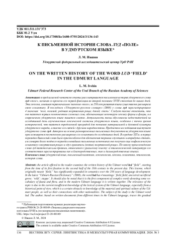 В предлагаемой работе рассматривается письменная история слова луд ‘поле’ в удмуртском языке, начиная с момента его первой фиксации во второй половине XVIII в. и заканчивая употреблением в наши дни. Для достижения поставленной цели предполагается решить следующие задачи: 1) выписать исследуемое слово со всеми значениями из словарей и грамматик XVIII столетия, сохранив особенности первичного графико-орфографического оформления; 2) обратить внимание на письменную фиксацию лексемы в важнейших лексикографических изданиях более позднего периода (XIX–XXI вв.) для показа более полной картины семантической трансформации анализируемой лексемы в диахронии; 3) привести элементарные этимологические сведения.