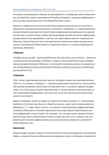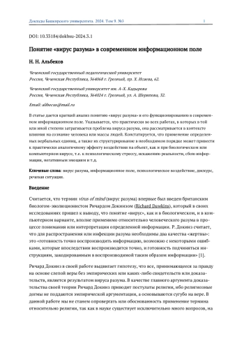 В статье дается краткий анализ понятию «вирус разума» и его функционированию в современном информационном поле. Указывается, что практически во всех работах, в которых в той или иной степени затрагивается проблема вируса разума, она рассматривается в контексте влияния на сознание человека или массы людей. Констатируется, что применение определенных вербальных единиц, а также их структурирование в необходимом порядке может привести к практически аналогичному эффекту воздействия на объект, как и при биологическом или компьютерном вирусе, т. е. к психологическому стрессу, искажению реальности, сбою информации, негативным эмоциям и т. д.