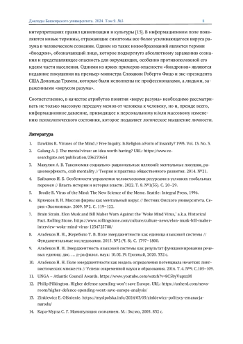 15. Medushevsky A. N. Cognitive warfare: social control, mind control and a tool for global domination. Part 2 // Questions of theoretical economics. 2023. No. 3. P. 92-107. 10.52342/2587- 7666VTE_2023_3_92_107. DOI: 10.52342/2587-7666VTE_2023_3_92_107