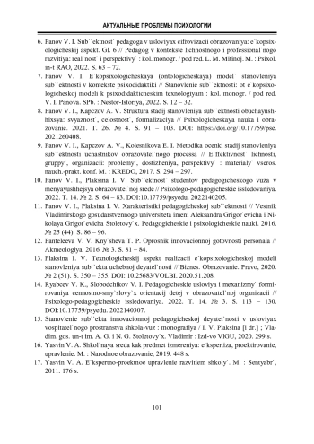 10. Панов В. И., Плаксина И. В. Субъектность студентов педагогического вуза в меняющейся образовательной среде // Психолого-педагогические исследования. 2022. Т. 14. № 2. С. 64 - 83. https://doi.org/10.17759/psyedu.2022140205.