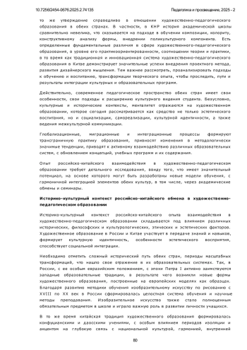 Статья посвящена анализу российско-китайского сотрудничества в сфере художественно-педагогического образования в условиях современной глобализации и ускоренной цифровизации. Исследуются ключевые исторические, культурные и педагогические аспекты взаимодействия двух крупнейших стран, включая влияние классической советской системы образования на китайскую художественную школу, также актуальные современные тенденции, такие как интеграция цифровых технологий и искусственного интеллекта, междисциплинарные подходы и кросс-культурные исследования, академические обмены и стажировки. Особое внимание уделено детальному сравнительному анализу педагогических практик России и Китая, системному выявлению их сильных сторон и конкретным возможностям для взаимного обогащения. Авторы рассматривают, как традиционные методы обучения органично сочетаются с инновационными подходами, также как культурные различия непосредственно влияют на формирование современных образовательных стратегий. В работе методы историко-культурного анализа, сравнительной педагогики, а также практико-ориентированный подход, включающий разработку учебных программ и экспериментальное обучение. Исследование опирается на анализ академических публикаций, образовательных стандартов и реального опыта совместных проектов между российскими и китайскими вузами. Научная новизна исследования заключается в комплексном изучении и анлизе российско-китайского сотрудничества в области художественно-педагогическом образовании на современном этапе, включая разработку адаптированных учебных планов и программ и критериев оценки. Авторы приходят к выводу, что интеграция традиционных и инновационных методов, а также системное усиление академических обменов способствуют формированию мультикультурной образовательной среды в условиях цифровой трансформации. Однако сохраняются вызовы, такие как сложный баланс между традициями и модернизацией на практике, а также острая необходимость дальнейшей цифровизации. Перспективы развития очевидно включают расширение совместных программ, использование VR/AR-технологий и укрепление междисциплинарных связей в педагогический процесс. Дальнейшие исследования в области интеграции российских и китайских педагогических практик помогут глубже изучить механизмы культурного обмена и его влияния на обогащение художественного образования обеих стран, цель которого - как развить значимые профессиональные компетенции, так и укрепить социокультурную идентичность будущих специалистов. Тем важнее для обеих стран продолжение диалога культур в рамках новых форматов сотрудничества, чтобы успешно отвечать на вызовы, связанные с интернационализацией сферы образования.