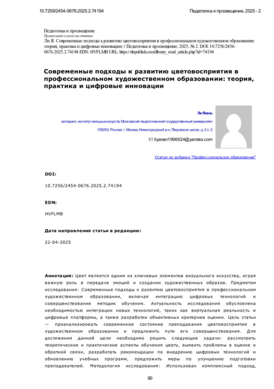 Цвет является одним из ключевых элементов визуального искусства, играя важную роль в передаче эмоций и создании художественных образов. Предметом исследования: Современные подходы к развитию цветовосприятия в профессиональном художественном образовании, включая интеграцию цифровых технологий и совершенствование методик обучения. Актуальность исследования обусловлена необходимостью интеграции новых технологий, таких как виртуальная реальность и цифровые платформы, а также разработки объективных критериев оценки. Цель статьи - проанализировать современное состояние преподавания цветовосприятия в художественном образовании и предложить пути его совершенствования. Для достижения данной цели необходимо решить следующие задачи: рассмотреть теоретические и практические аспекты обучения цвету, выявить проблемы в оценке и обратной связи, разработать рекомендации по внедрению цифровых технологий и обновлению учебных программ, предложить меры по улучшению подготовки преподавателей. Методология исследования: Использован комплексный подход, включающий теоретический анализ научной литературы по проблеме цветовосприятия, сравнительное исследование традиционных и современных методов обучения, анализ практического опыта внедрения цифровых технологий в образовательный процесс. Особое внимание уделено изучению опыта китайских учебных заведений в данной области. Новизна исследования, выводы: В данной статье дан системный анализ современного состояния и существующих проблем в сфере развития цветовосприятия в профессиональном художественном образовании, а также показана важная роль цвета как интуитивного и выразительного визуального языка в творчестве и преподавании искусства. Впервые выполнен комплексный анализ современных методов обучения цветовосприятию с учетом цифровых инноваций. Разработаны практические рекомендации по модернизации учебных программ, внедрению цифровых технологий и совершенствованию системы оценки для китайских художественных учебных заведений. Показана эффективность сочетания традиционной теории цвета с современными концепциями дизайна и применением цифровых платформ. Полученные результаты могут быть использованы в художественных школах и вузах различных стран для повышения качества подготовки специалистов в области визуальных искусств.