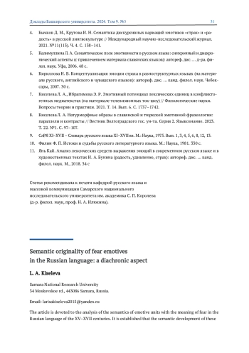 5. Калимуллина Л. А. Семантическое поле эмотивности в русском языке: синхронный и диахронический аспекты (с привлечением материала славянских языков): автореф. дис. … д-ра. филол. наук. Уфа, 2006. 48 с. EDN: NOYOZT
