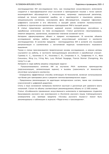 8. Фань Синьжань. Исследование применения технологий искусственного интеллекта в преподавании русского языка как иностранного в Китае // Молодой учёный. 2025. № 10(561). С. 200-203.