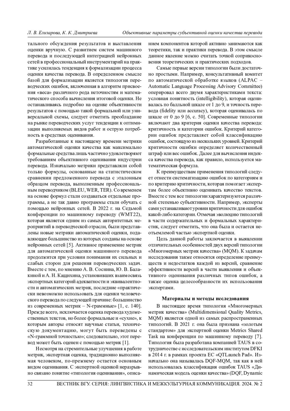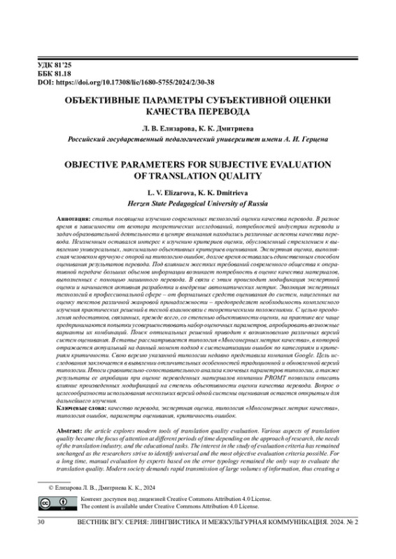 ЕЛИЗАРОВА Л. В., ДМИТРИЕВА К.К. ОБЪЕКТИВНЫЕ ПАРАМЕТРЫ СУБЪЕКТИВНОЙ ОЦЕНКИ КАЧЕСТВА ПЕРЕВОДА // ВЕСТНИК ВОРОНЕЖСКОГО ГОСУДАРСТВЕННОГО УНИВЕРСИТЕТА. СЕРИЯ: ЛИНГВИСТИКА И МЕЖКУЛЬТУРНАЯ КОММУНИКАЦИЯ. 2024. № 2