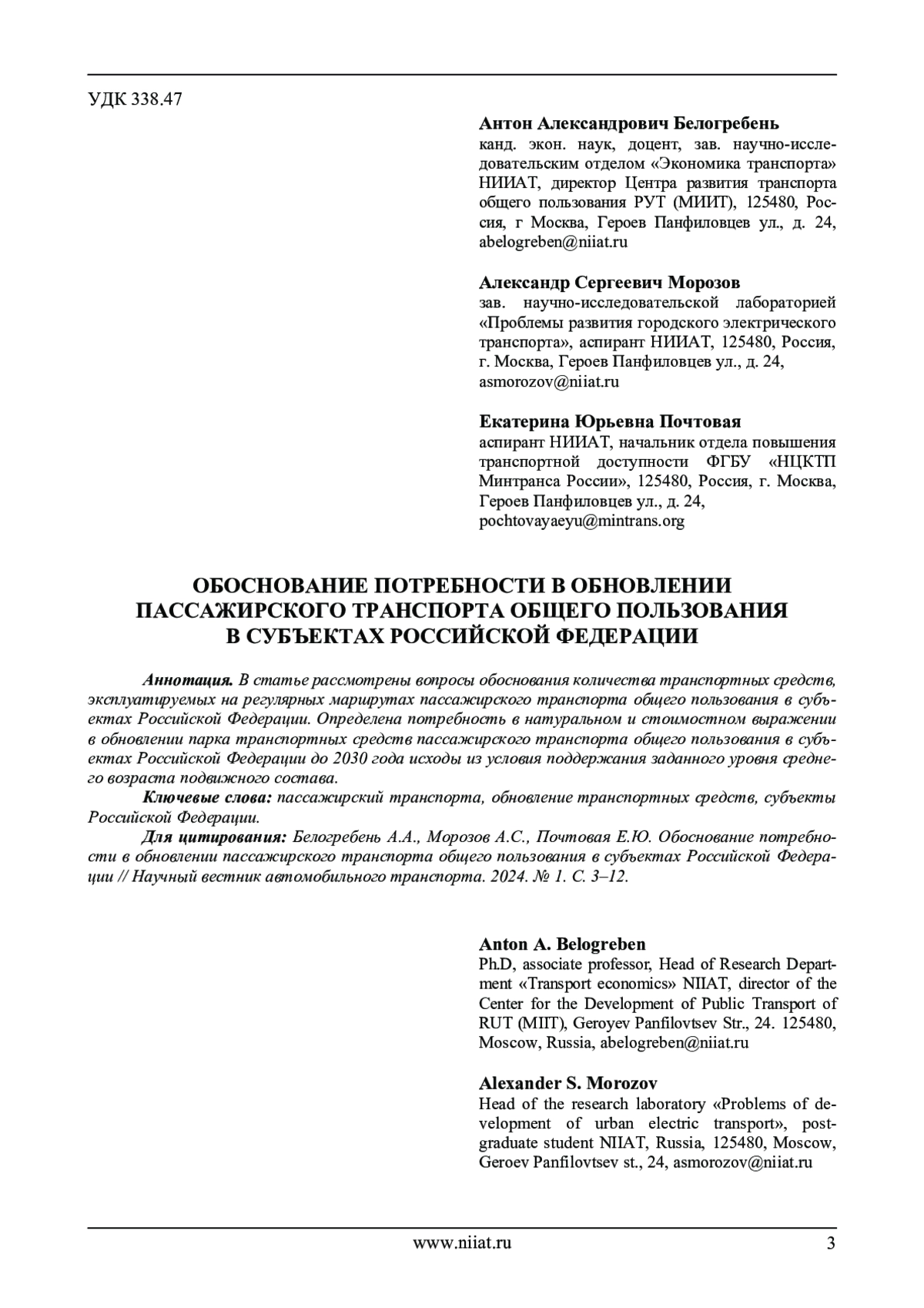 В статье рассмотрены вопросы обоснования количества транспортных средств, эксплуатируемых на регулярных маршрутах пассажирского транспорта общего пользования в субъектах Российской Федерации. Определена потребность в натуральном и стоимостном выражении в обновлении парка транспортных средств пассажирского транспорта общего пользования в субъектах Российской Федерации до 2030 года исходы из условия поддержания заданного уровня среднего возраста подвижного состава.