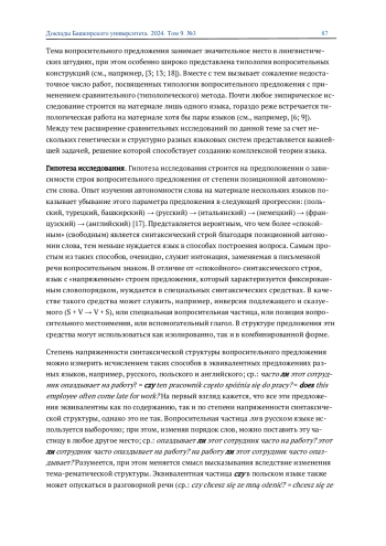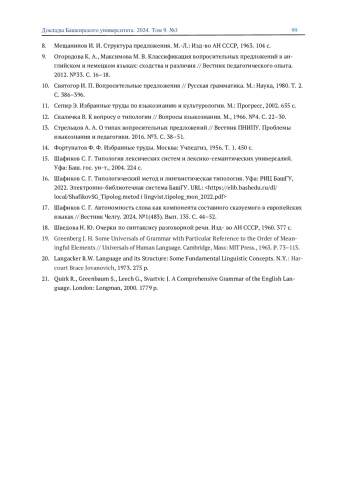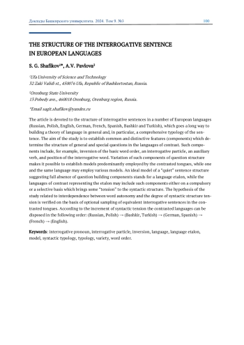 ШАФИКОВ С. Г. СТРУКТУРА ВОПРОСИТЕЛЬНОГО ПРЕДЛОЖЕНИЯ В ЕВРОПЕЙСКИХ ЯЗЫКАХ // ДОКЛАДЫ БАШКИРСКОГО УНИВЕРСИТЕТА. 2024. Т. 9 № 3