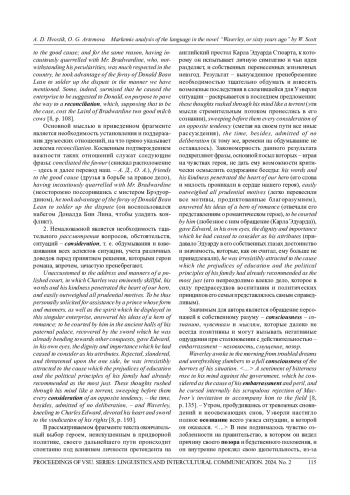 Цель данной статьи - формализованный содержательный анализ языка исторического романа «Уэверли» (1814) сэра Вальтера Скотта (1771-1832). Описанное исследование выполнено в русле маркемологии - лингвистического направления, предлагающего выделить в массиве текстов маркемы, особый вид ключевых слов на основе объективного показателя информативности лексемы -Индекса Текстуальной Маркированности (ИнТеМ). Проведенный маркемный анализ языка романа позволил выявить доминантную и вице-доминантную маркемы: disappointment ‘разочарование ’ и consideration ‘размышление ’ соответственно. В результате стратификации маркем установлены маркемное ядро в количестве 15 маркем и маркемная периферия - 35 маркем. Выявлены 10 групп равновесных, а следовательно, равнозначных маркем. В результате семантической классификации маркемы романа «Уэверли» распределены в семь семантических блоков: фундаментальные маркемы, межличностные маркемы, ментально-перцептивные маркемы, эмоциональные маркемы, качественные маркемы, социальные маркемы, морально-этические маркемы. Установлены три ключевых семантических блока: ментально-перцептивные маркемы, эмоциональные маркемы, маркемы, выражающие межличностные отношения. Среди ядерных маркем большинство принадлежит маркемам, описывающим ментально-перцептивные процессы. Маркемный анализ языка романа показывает, что автор придает особенное значение различным аспектам межличностного общения и взаимодействия, способности прийти к договоренности и примирению. Важной представляется необходимость глубокого размышления, рассмотрения всех аспектов ситуации, чем герои романа зачастую пренебрегают. Особо значимым для автора является обращение персонажей к собственному рассудку и сознанию как источнику мыслительной деятельности. В романе главенствуют негативные эмоции - разочарование и чувство стыда, смущения. Кроме того, акцент делается на необходимости осмысления поступков, комплексной рефлексии и, как следствие, исправлении ошибок.
