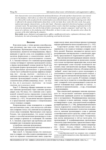 Ключевые фразы: существительные, уменьшительные и увеличительные суффиксы, модификационное производное, толковый словарь, помета, словарная статья, соотношение значения между производящим и производным