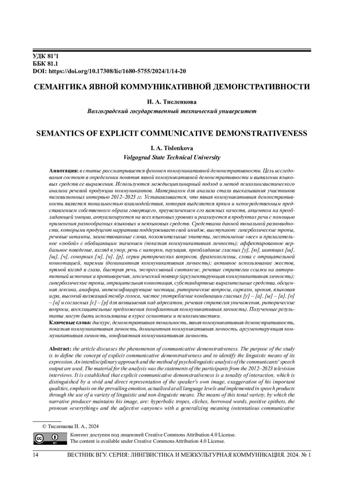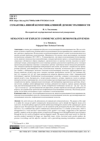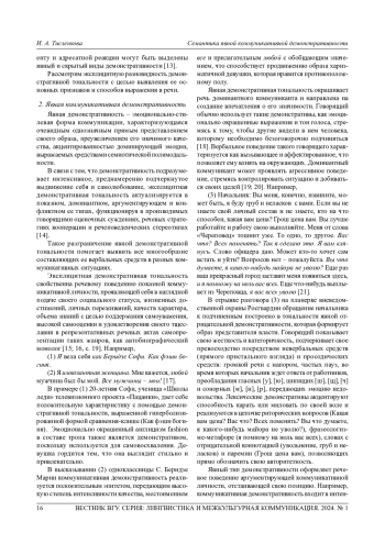 В статье рассматривается феномен коммуникативной демонстративности. Цель исследования состоит в определении понятия явной коммуникативной демонстративности и выявлении языковых средств ее выражения. Используются междисциплинарный подход и метод психолингвистического анализа речевой продукции коммуникантов. Материалом для анализа стали высказывания участников телевизионных интервью 2012-2023 гг. Устанавливается, что явная коммуникативная демонстративность является тональностью взаимодействия, которая выделяется ярким и непосредственным представлением собственного образа говорящего, преувеличением его важных качеств, акцентом на преобладающей эмоции, актуализируется на всех языковых уровнях и реализуется в продуктах речи с помощью применения разнообразных языковых и неязыковых средств. Средствами данной тональной разновидности, которыми продуцент нарратива поддерживает свой имидж, выступают: гиперболические тропы, речевые штампы, заимствованные слова, положительные эпитеты, местоимение «все» и прилагательное «любой» с обобщающим значением (показная коммуникативная личность); аффектированное вербальное поведение, взгляд в упор, речь с напором, паузация, преобладание гласных [у], [ю], шипящих [ш], [щ], [ч], сонорных [м], [н], [р], серии риторических вопросов, фразеологизмы, слова с отрицательной коннотацией, паремии (доминантная коммуникативная личность); активное использование жестов, прямой взгляд в глаза, быстрая речь, экспрессивный синтаксис, речевые стратегии ссылки на авторитетный источник и противоречия, лексический повтор (аргументирующая коммуникативная личность); гиперболические тропы, отрицательная коннотация, субстандартные выразительные средства, обсценная лексика, анафора, интенсифицирующие частицы, риторические вопросы, сарказм, ирония, языковая игра, высокий визжащий тембр голоса, частое употребление комбинации гласных [у] - [а], [ы] - [а], [о] - [а] и согласных [с] - [р] для возвышения над адресатом, речевая стратегия уничижения, риторические вопросы, восклицательные предложения (конфликтная коммуникативная личность). Полученные результаты могут быть использованы в курсе семиотики и психолингвистики.