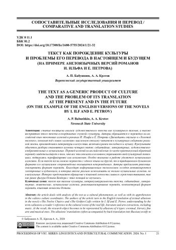Статья посвящена анализу художественного текста как культурного явления, а также восприятию этого текста в координатах «чужой» культуры. Авторы обращаются к переводам на английский язык текстовых аллюзий в романах И. Ильфа и Е. Петрова «Двенадцать стульев» и «Золотой теленок», понимая под словом «аллюзия» мысленную отсылку читателя к культурным событиям реальной жизни, произведениям литературы и искусства, включая в рамки последнего и музыку. В результате объектом разбора становятся аллюзии четырех типов: событийные, литературные, художественноизобразительные и музыкальные. Перевод аллюзий на английский язык (и часто практикуемый обратный перевод) свидетельствует о том, что все эти отсылки в основном утрачивают свой культурный потенциал, подвергаясь перефразировке или искажению. Особое внимание в работе уделяется музыкальным аллюзиям. Если текст песни можно перевести с одного языка на другой, то в традиционном бумажном формате его музыкальное сопровождение оказывается непереводимым. Авторы предлагают революционизировать формат перевода. Благодаря информационным технологиям сегодня активизируются электронные и аудиокниги, в которых вполне реально использовать не только музыкальные аллюзии, но и визуальные. Интерес представляет обращение к языковой личности главного героя повествования, так как ранее фигура Остапа Бендера с этих позиций не изучалась.