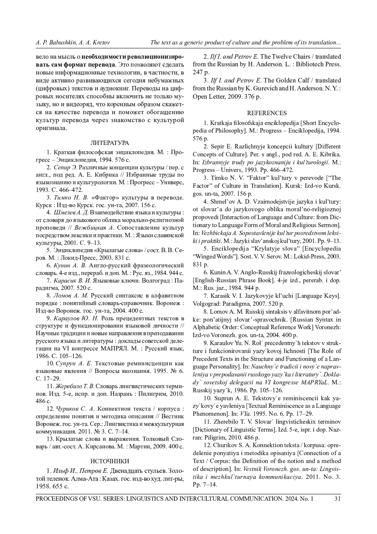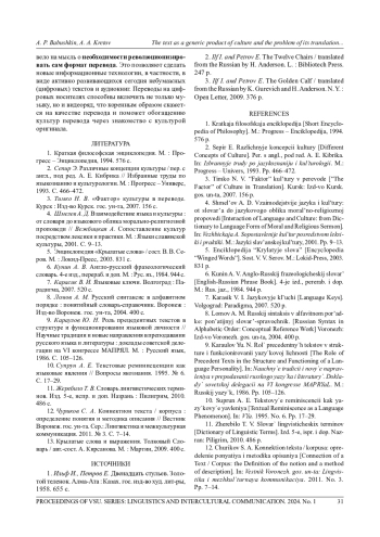 9. Караулов Ю. Н. Роль прецедентных текстов в структуре и функционировании языковой личности // Научные традиции и новые направления в преподавании русского языка и литературы: доклады советской делегации на VI конгрессе МАПРЯЛ. М.: Русский язык, 1986. С. 105-126.