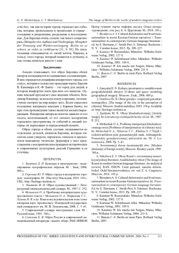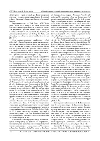 Предлагаемое исследование посвящено рассмотрению образа Берлина в немецкой художественной литературе писателей, эмигрировавших в Германию в 90-е гг. XX в. Цель данной статьи - рассмотреть, как формируется художественный образ города Берлина в произведениях двух писателей-эмигрантов: В. Каминера и К.-Ф. Банчу, выявить, как авторы определяют основные параметры понятия «город Берлин», а также раскрывают систему оппозиций, которые организуют комплексный образ города Берлина, таких как город как взаимодействие и противостояние культур Восточной и Западной Европы, их национальная специфика, проявляющаяся во всех сферах жизни и деятельности человека, а особенно иммигрантов, особенности столичной жизни, жители Берлина, которые неотделимы от города и формируют его образ, а берлинцы - это и рожденные в этом городе, и эмигранты, и беженцы. В фокусе исследования находятся и языковые средства, которые выбирают авторы для воспроизведения своих эмоциональных ассоциаций и впечатлений. Некоторые художественные образы Берлина приобретают иронические коннотации. Результаты исследования показали, что образ Берлина обоих авторов складывается из одинаковых составляющих. В них отражается специфика конкретного города, его статус, история и только ему присущие черты. Берлин В. Каминера и К.-Ф. Банчу - это город, который является отражением не только узкого мирка каждого индивида, но и отражением национальной картины мира. При этом каждый предлагает свое видение объекта и использует различные языковые средства, приемы и трансформации.