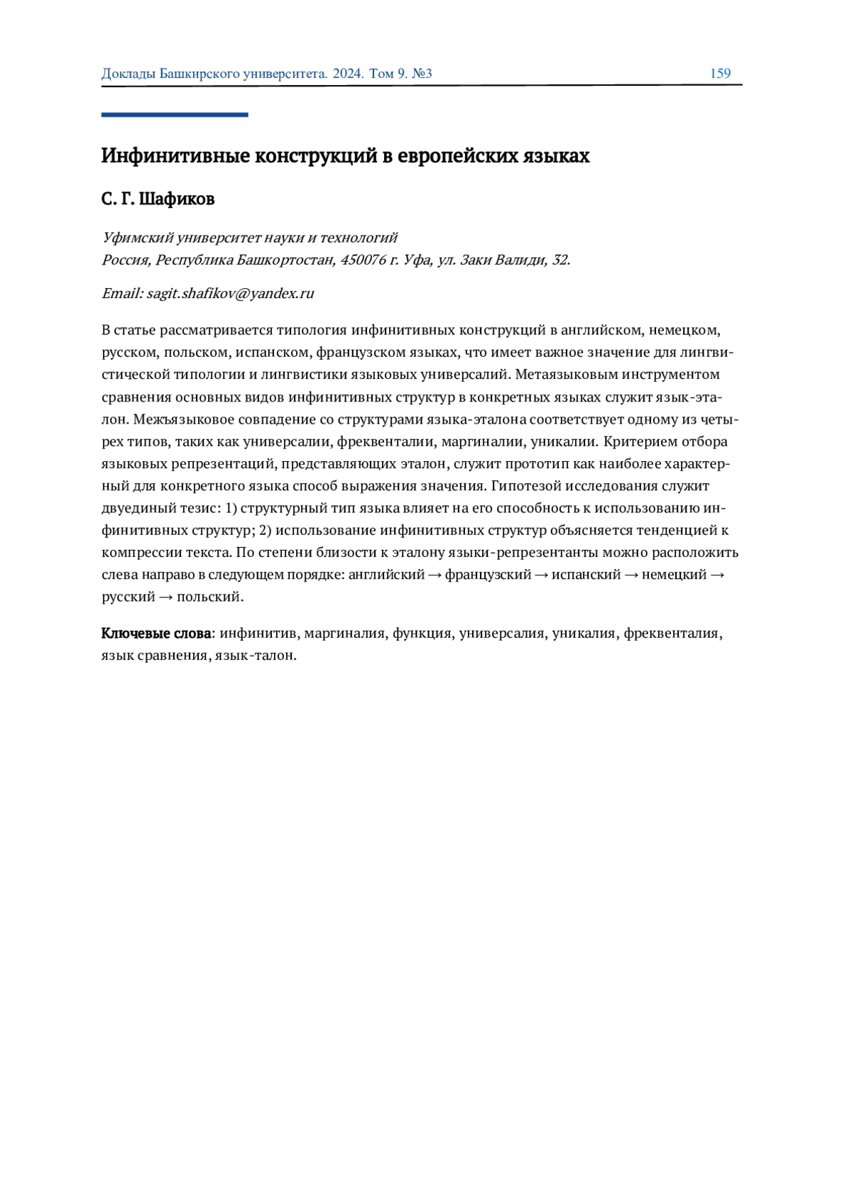 6. Shafikov S. G. Pronoun-and-verb structures in a group of European languages // Doklady Bashkirskogo Universiteta. 2022. Vol. 7. No. 6. P. 447-472. EDN: WWKEZZ