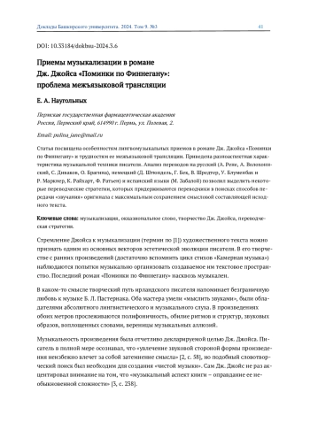 Статья посвящена особенностям лингвомузыкальных приемов в романе Дж. Джойса «Поминки по Финнегану» и трудностям ее межъязыковой трансляции. Приведена разноаспектная характеристика музыкальной техники писателя. Анализ переводов на русский (А. Рене, А. Волохоннский, С. Диваков, О. Брагина), немецкий (Д. Штюндель, Г. Бек, В. Шредтер, У. Блуменбах и Р. Маркнер, К. Райхарт, Ф. Ратьен) и испанский языки (М. Забалой) позволил выделить некоторые переводческие стратегии, которых придерживаются переводчики в поисках способов передачи «звучания» оригинала с максимальным сохранением смысловой составляющей исходного текста.