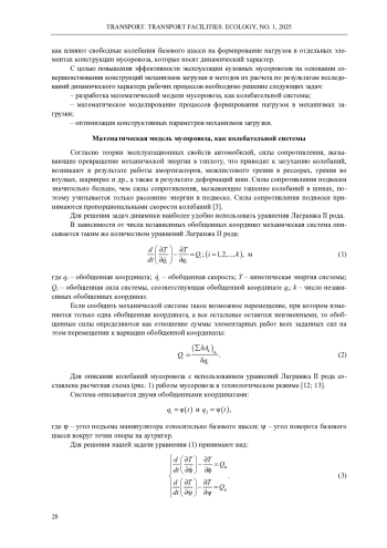 Обоснована актуальность проведения исследования динамического характера рабочих процессов кузовных мусоровозов с учетом свободных колебаний рамы автомобиля. Обобщены результаты исследований влияния конструктивного исполнения манипуляторов кузовных мусоровозов с боковой загрузкой на формирование усилий в конструктивных элементах мусоровоза при взаимодействии их с нагрузкой, создаваемой весом контейнера при выполнении рабочих операций: подъем, опрокидывание, опускание. Составлена модель и приведена расчетная схема мусоровоза как колебательной системы. Определен характер колебаний рамы мусоровоза в рабочем режиме. Установлены закономерности формирования усилий в системе «захват - бак - захват». С учетом свободных затухающих колебаний базового шасси выполнены исследования формирования нагрузок и оптимизация параметров серийно выпускаемых механизмов загрузки, а также оригинальных технических решений, подтвержденных патентами на изобретения. Для определения нагрузок, возникающих в системе «захват - бак - захват» серийного «вилочного» захвата, разработаны расчетные схемы и составлены уравнения равновесия действия сил. Полученные зависимости позволяют оценить изменение величины усилий в элементах конструкции захвата за рабочий цикл работы манипулятора с учетом колебаний базового шасси и их отклонение от статических нагрузок. Моделированием сил и моментов в элементах новой конструкции захвата, обеспечивающей вертикальное положение контейнера в процессе его подъема, установлено, что после затухания колебаний базового шасси происходит стабилизация всех сил, действующих в системе, моменты компенсируют действие друг друга таким образом, что суммарный момент стремится к нулю. На основании выполненных исследований дано решение актуальной научно-технической задачи, состоящей в совершенствовании методов расчета машин для сбора и вывоза твердых коммунальных отходов, обеспечивающих повышение эффективности их эксплуатации за счет снижения усилий в элементах конструкции захвата, повышения надежности системы «захват - бак - захват» манипулятора и его привода, повышения производительности мусоровозов и экологичности их работы.