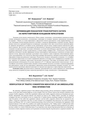 Авторами путем анализа значительного объема данных, полученных с использованием комплексов измерительных программно-технических, установленных стационарно на основных городских транспортных магистралях (на примере г. Перми), на основе нормативного определения понятия транспортного затора сформулированы и научно обоснованы количественный показатель состояния и индикатор формирования заторовой ситуации. Предложенные показатель и критерий базируется на процедуре «скользящего окна» при статистическом осреднении времени движения автомобилей в случайном потоке транспортных средств между измерительными комплексами (рубежами контроля). Для изучения закономерностей предложенного авторами количественного показателя и критерия заторовой ситуации выполнено длительное наблюдение за потоком автомобильного транспорта на нерегулируемом кольцевом пересечении, которое осуществлялось в течение января и февраля 2023 г. В результате статистической обработки полученного массива информации изучены закономерности предложенного показателя состояния транспортного потока, определены параметры «скользящего окна» (ширина и сдвиг по времени), обеспечивающие приемлемое структурирование этого показателя. Выполнена проверка предложенного авторами количественного критерия образования заторов автомобильного транспорта. В результате натурного наблюдения установлено, что на выбранном кольцевом пересечении отсутствуют направления движения, на которых могут генерироваться заторовые ситуации, движение по кольцевому пересечению организовано рационально. Настоящее исследование (вместе с ранее представленными публикациями об изучении движения на Х- и Т-образных пересечениях) свидетельствует, что целесообразно использовать разработанные авторами количественный показатель состояния и индикатор формирования транспортного затора как для оперативного определения угрозы возникновения заторовых ситуаций, так и для оценки качества организации движения транспорта на городских регулируемых и нерегулируемых пересечениях.