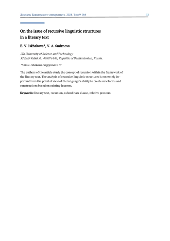 ИСХАКОВА Э. В., СМИРНОВА В. А. К ВОПРОСУ О РЕКУРСИВНЫХ ЛИНГВИСТИЧЕСКИХ СТРУКТУРАХ В ХУДОЖЕСТВЕННОМ ТЕКСТЕ // ДОКЛАДЫ БАШКИРСКОГО УНИВЕРСИТЕТА. 2024. Т. 9 № 4