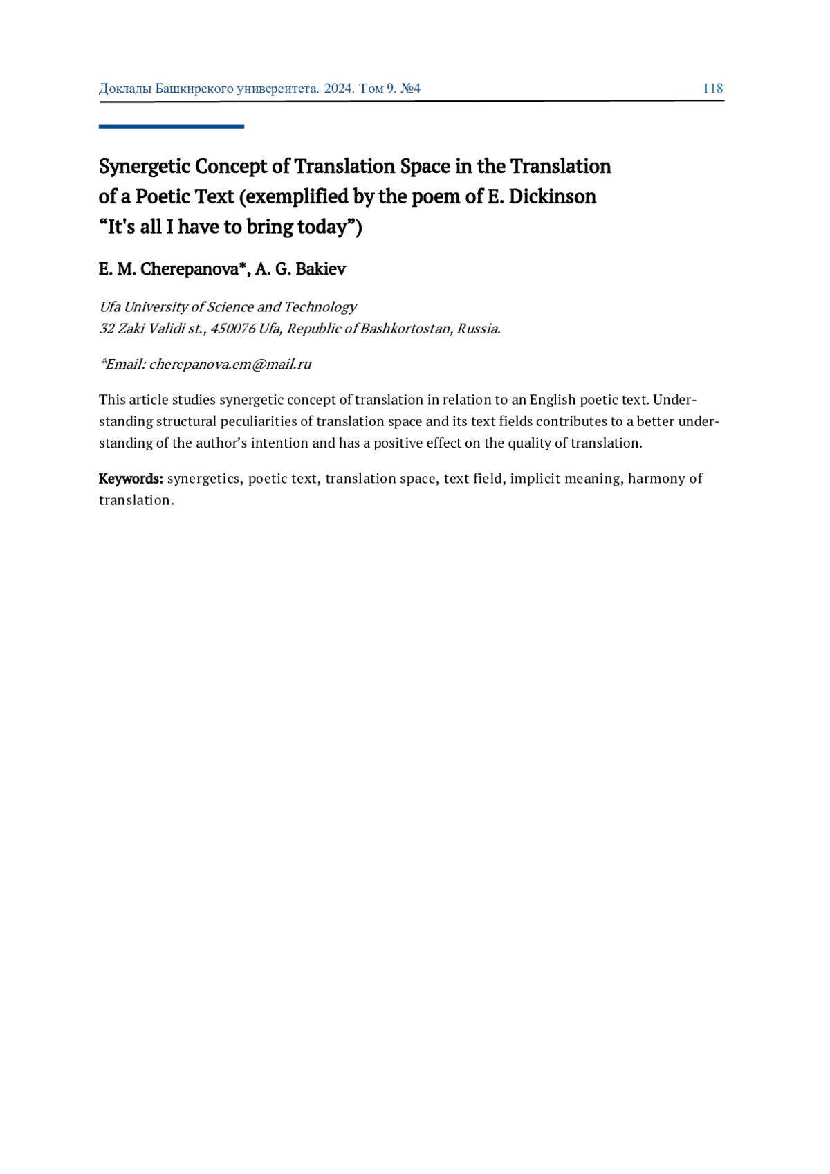 В данной статье рассматривается синергетическая концепция переводческого пространства применительно к англоязычному поэтическому тексту. Понимание особенностей функционирования переводческого пространства и его текстовых полей способствует лучшему пониманию авторского замысла и положительно влияет на качество перевода.