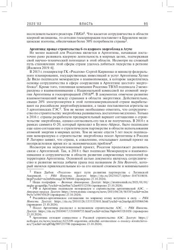 6. Яковлев П.П. 2019. Атомный век Аргентины (к 45-летию ввода в строй АЭС Atucha). - Латинская Америка. № 3. C. 5-17. EDN: YZAFBZ