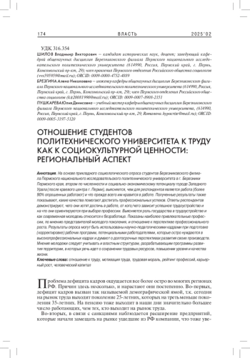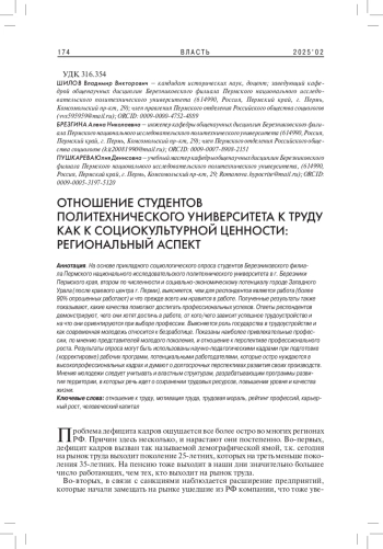 На основе прикладного социологического опроса студентов Березниковского филиала Пермского национального исследовательского политехнического университета в г. Березники Пермского края, втором по численности и социально-экономическому потенциалу городе Западного Урала (после краевого центра г. Перми), выясняется, чем для респондентов является работа (более 90% опрошенных работают) и что прежде всего им нравится в работе. Полученные результаты также показывают, какие качества помогают достигать профессиональных успехов. Ответы респондентов демонстрируют, чего они хотят достичь в работе, от кого/чего зависит успешное трудоустройство и на что они ориентируются при выборе профессии. Выясняется роль государства в трудоустройстве и как современная молодежь относится к безработице. Показаны наиболее привлекательные профессии, по мнению представителей молодого поколения, и отношение к перспективе профессионального роста. Результаты опроса могут быть использованы научно-педагогическими кадрами при подготовке (корректировке) рабочих программ, потенциальными работодателями, которые остро нуждаются в высокопрофессиональных кадрах и думают о долгосрочных перспективах развития своих производств. Мнения молодежи следует учитывать и властным структурам, разрабатывающим программы развития территории, в которых речь идет о сохранении трудовых ресурсов, повышении уровня и качества жизни.