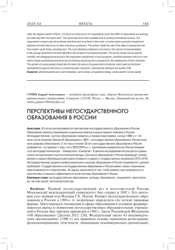 В статье рассматриваются перспективы негосударственного образования в России. Образование является важнейшим социальным лифтом в жизни каждого человека в России. Негосударственное, частное образование появилось в период перестройки, в конце 1980-х гг. Но лишь после принятия Закона об образовании в 1992 г. негосударственное образование в России получило правовое обоснование. С тех пор в течение 30 лет негосударственное образование в России развивается, что привело к тому, что в 2023/2024 уч./г. крупнейшим университетом России впервые стал негосударственный вуз - Университет «Синергия». В данном исследовании используется сравнительно-исторический и прогностический методы. Школьное образование в России формирует знания, умения и навыки обучающихся для сдачи основного и единого государственных экзаменов (ОГЭ и ЕГЭ). Негосударственное среднее профессиональное и высшее образование в России справляются с данной проблемой. Государственное и негосударственное образование в России имеют своих сторонников, свои возможности и перспективы. Их задача заключается в том, чтобы выявить свои возможности и перспективы и повысить эффективность всей системы образования в России.