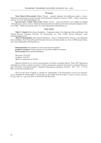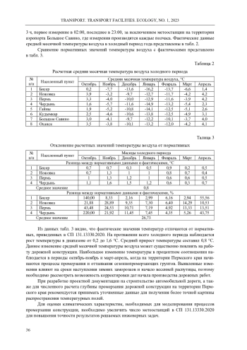 При решении задач распределения температуры в дорожной конструкции, в том числе при определении глубины промерзания, необходимо уделить особое внимание слою снежного покрова, расположенного на откосах и у основания насыпи автомобильной дороги. Дорожная конструкция промерзает неравномерно. Снег имеет малую теплопроводность, что способствует защите грунта от глубокого промерзания. В течение зимнего периода с проезжей части производят механизированную уборку снега, в то время как на откосах и у основания насыпи происходит накопление снежного массива на протяжении всего зимнего периода. Это создает сложную картину промерзания и существенно влияет на распределение изотермы 0 °C внутри дорожной конструкции. В связи с этим необходимо определить характеристики снежного покрова на территории Пермского края для получения более точной картины промерзания конструкции. Характеристики снежного покрова существенно зависят от внешних климатических факторов и условий местности. Произведен анализ климатических характеристик на восьми метеостанциях Пермского края. Выявлено различие между нормативными и фактическими значениями температуры наружного воздуха в период с октября по апрель. Определена средняя месячная высота снежного покрова, а также вероятность установления снежного покрова в осенние месяцы и вероятность сохранения снежного покрова в апреле. Проанализирован опыт исследования теплофизических характеристик снежного покрова российских и зарубежных ученых и выбраны необходимые значения плотности и теплопроводности снега. Рассчитана удельная теплоемкость снежного покрова толщиной до 30 см.