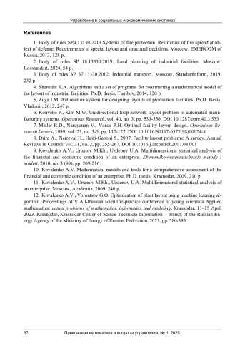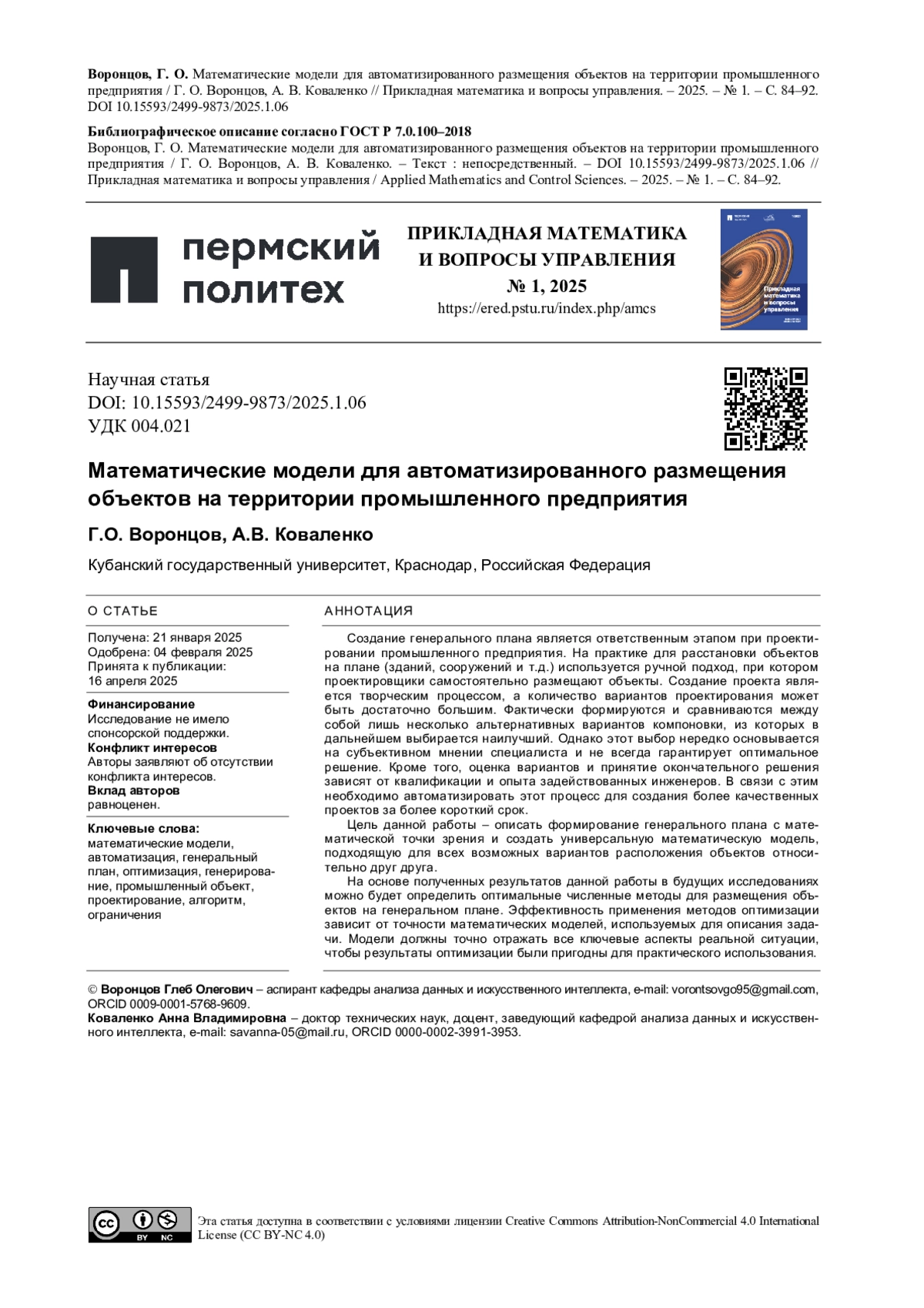 12. Коваленко, А.В. Оптимизация компоновки завода с помощью алгоритма машинного обучения / А.В. Коваленко, Г.О. Воронцов // Прикладная математика: современные проблемы математики, информатики и моделирования: мат. V Всероссийской научно-практической конференции молодых ученых, Краснодар, 11-15 апреля 2023 года. - Краснодар: ФГБУ “Российское энергетическое агентство” Минэнерго России Краснодарский ЦНТИ - филиал ФГБУ “РЭА” Минэнерго России, 2023. - С. 380-383. EDN: AJOFFY