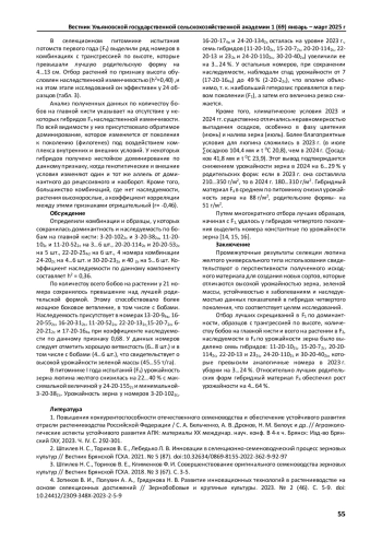 Создание сортов желтого кормового люпина универсального типа использования конкретно для дерново - подзолистых песчаных почв легкого механического состава юго-запада Брянской области весьма актуально как в плане высокобелковой кормовой культуры для животноводства, так и поддержания уровня их плодородия. Для гибридизации привлекли родительские формы местной селекции в реципрокные скрещивания, имеющих высокую специфическую комбинационную способность по высоте люпина, количеству бобов на главной кисти и всего на растении. На основе доминирования в F1, трансгрессии в F2 и наследуемости в F4 по основным признакам структурного анализа и урожайности зерна растений люпина проведены отборы лучших гибридного материала. Из отобранных образцов наследуемость в селекционном питомнике первого года (F4) относительно лучших родительских форм по высоте растений подтвердили 24 комбинации, превысив на 2…13 см с h2 = 0,40, по количеству бобов на главной кисти у 17 номеров на 2.6 шт. с коэффициентом h2 = 0,36. По общему количеству бобов на растении 16 номеров проявили наследуемость с превышением на 2-20 бобов с коэффициентом h2 = 0,68. Урожай зерна у гибридов F3 составил 240.480 г/м2, что выше родительских форм на 20.220 г/м2. С урожайностью 400 - 480 г/м2 выделились образцы 2-20-82с, 3-20-382а, 9-20-734в, 11-20-522с, 13-20-1 и 94в, 17-20132с, 17-20-164в, 22-20-20 и 254d, 20-20-532с, 24-20-1552с. В F4 продуктивность у некоторых образцов гибридного материала и родительских форм оказалась ниже на 7.49 %, но наследуемость у отборов сохранилась. Отмечено преимущество по урожайности зерна на 4.24 % у семи гибридов 11-20-102с, 15-20-72с, 20-20-1142с, 22-20-13 и 232с, 24-20-1102с и 30-20-402а, и три гибрида остались на уровне 2023 г.: 3-20-1022с, 16-20-74в и 24-20-1342с, которые будут исследоваться в питомниках испытания потомств с целью создания нового сорта.