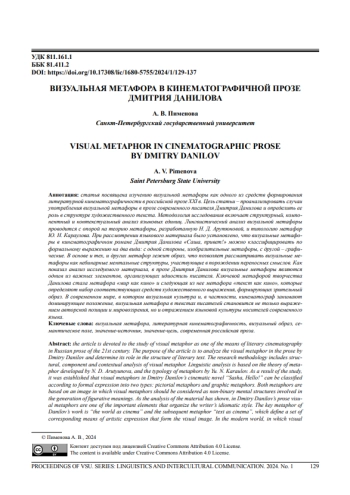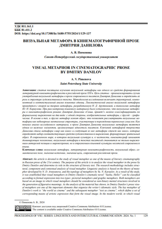 Статья посвящена изучению визуальной метафоры как одного из средств формирования литературной кинематографичности в российской прозе XXI в. Цель статьи - проанализировать случаи употребления визуальной метафоры в прозе современного писателя Дмитрия Данилова и определить ее роль в структуре художественного текста. Методология исследования включает структурный, компонентный и контекстуальный анализ языковых единиц. Лингвистический анализ визуальной метафоры проводится с опорой на теорию метафоры, разработанную Н. Д. Арутюновой, и типологию метафор Ю. Н. Караулова. При рассмотрении языкового материала было установлено, что визуальные метафоры в кинематографичном романе Дмитрия Данилова «Саша, привет!» можно классифицировать по формальному выражению на два вида: с одной стороны, изобразительные метафоры, с другой - графические. В основе и тех, и других метафор лежит образ, что позволяет рассматривать визуальные метафоры как небинарные ментальные структуры, участвующие в порождении переносных смыслов. Как показал анализ исследуемого материала, в прозе Дмитрия Данилова визуальные метафоры являются одним из важных элементов, организующих идиостиль писателя. Ключевой метафорой творчества Данилова стала метафора «мир как кино» и следующая из нее метафора «текст как кино», которые определяют набор соответствующих средств художественного выражения, формирующих зрительный образ. В современном мире, в котором визуальная культура и, в частности, кинематограф занимают доминирующее положение, визуальная метафора в текстах писателей становится не только выражением авторской позиции и мировоззрения, но и отражением языковой культуры носителей современного языка.