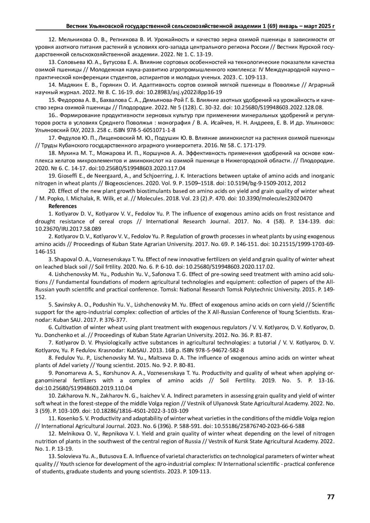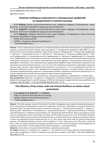 ИСАЙЧЕВ В. А., АНДРЕЕВ Н. Н., ФЕДОРОВА И. Л. ВЛИЯНИЕ СВОБОДНЫХ АМИНОКИСЛОТ И МИНЕРАЛЬНЫХ УДОБРЕНИЙ НА ПРОДУКТИВНОСТЬ ОЗИМОЙ ПШЕНИЦЫ // ВЕСТНИК УЛЬЯНОВСКОЙ ГОСУДАРСТВЕННОЙ СЕЛЬСКОХОЗЯЙСТВЕННОЙ АКАДЕМИИ. 2025. № 1 (69)
