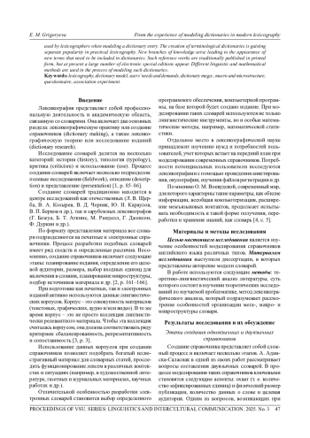 Статья посвящена исследованию разработки моделей словарей английского языка в современных лексикографических исследованиях. Рассматриваются основные этапы создания одноязычных и двуязычных справочников, изучается использование корпусных данных в процессе моделирования изданий. Выделяются сходства в процессе создания печатных и электронных словарей, такие как планирование справочника, определение потенциальной структуры, работа по проектированию мега-, макро- и микроструктуры изданий и др. Отличительной чертой моделирования электронного издания является подготовка особого программного обеспечения, на котором будут размещаться материалы словаря. В настоящее время уделяется особое внимание нуждам и потребностям пользователя. В рамках исследования потребностей потенциальной аудитории словарей лексикографы прибегают к использованию особого инструмента - анкетирования пользователей как подготовительного этапа в процессе создания словаря определенного типа. Анализ ответов аудитории на вопросы позволяет лексикографам сформулировать принципы организации мега-, макро- и микроструктуры издания, принимая во внимание потребности потенциального адресата. Отдельное место в лексикографических исследованиях принадлежит проведению ассоциативного эксперимента, результаты которого (дополнительная помета к лексическим единицам) могут быть непосредственно использованы лексикографами в процессе моделирования словарной статьи. Создание терминологических изданий приобретает отдельную популярность в практической лексикографии. Формируются новые отрасли знаний, что ведет к появлению новых терминов, которые необходимо включать в словари. Такие справочники традиционно публикуются в печатном варианте, однако в настоящее время появляется большое количество электронных специальных изданий, моделирование которых происходит с помощью различных лингвистических и математических методов.