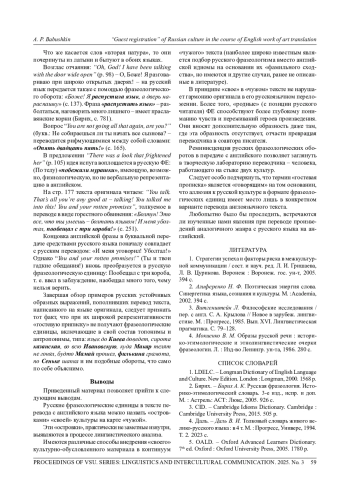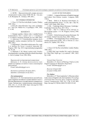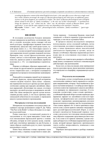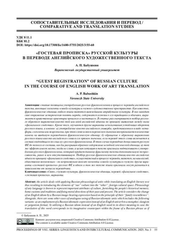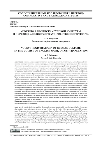 БАБУШКИН А. П. «ГОСТЕВАЯ ПРОПИСКА» РУССКОЙ КУЛЬТУРЫ В ПЕРЕВОДЕ АНГЛИЙСКОГО ХУДОЖЕСТВЕННОГО ТЕКСТА // ВЕСТНИК ВОРОНЕЖСКОГО ГОСУДАРСТВЕННОГО УНИВЕРСИТЕТА. СЕРИЯ: ЛИНГВИСТИКА И МЕЖКУЛЬТУРНАЯ КОММУНИКАЦИЯ. 2025. № 3