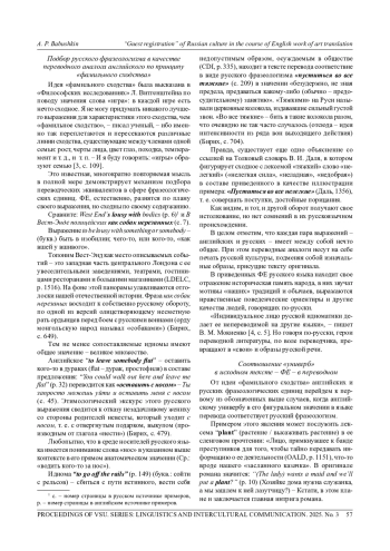 Статья посвящена употреблению русских фразеологизмов в процессе перевода английского текста, вносящих элементы «своей» культуры в «чужое» художественное пространство. Как известно, фразеологические единицы любого языка являются важнейшими атрибутами культуры. В них находит свое отражение историческая помять народа, содержатся аллюзии к его традициям и обычаям, выражаются нравственные ориентиры прошлого и настоящего. В статье рассматривается подбор русского образного выражения вместо той или иной английской идиомы по принципу выявления между ними «фамильного сходства». Кроме того, изучаются другие варианты использования устойчивых оборотов русского языка, а именно: а) употребление вместо английского универба, представленного в виде метафоры, сленгизма или жаргонизма, при этом слово в своем переносном значении воспринимается в качестве намека на вводимую переводчиком фразеологическую единицу; б) обращение к образному выражению русского языка вместо английского слова в его прямом значении, если перевод этого слова включается в состав «подходящего по смыслу» русского фразеологизма. В этом случае переводчик домысливает русскую ФЕ до полного ее состава, как бы раскрывая образное содержание исходной лексической единицы; в) тот же эффект имеет место, когда не слово, а целая ситуация в тексте оригинала подталкивает к употреблению русского фразеологизма, который придает данному фрагменту текста дополнительную экспрессивность, ранее в нем отсутствовавшую. Подбор русских фразеологических единиц вместо английских идиом по принципу «фамильного сходства», осуществляемый в процессе перевода, является, на наш взгляд, единственно возможным - он непроизвольно вносит элементы «своей» культуры в «чужую; другие варианты «гостевой прописки» русских ФЕ в одном и том же тексте языка оригинала могут разниться в зависимости от замысла переводчика.