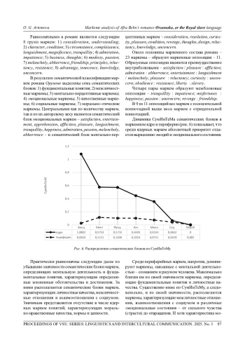 Цель предлагаемой статьи - определениемаркемного своеобразия английского галантно-героического романа «Оруноко, или Царственный раб» (1688) первой профессиональной английской писательницы Афры Бен. Предмет исследования составляет анализ маркем, выделенных в тексте романа. Исследование выполнено в русле маркемологии - лингвистического направления, позволяющего на основе выделения особого вида ключевых слов - маркем - осуществить лингвистический анализ текста и выделить доминирующие в нем смыслы. Особенностью данного вида ключевых слов является одновременный учет частоты употребления и информативности каждой лексемы. Средством оценки информативности лексемы служит автоматически вычисляемый Индекс Текстуальной Маркированности (ИнТеМ). Проведенный маркемный анализ языка романа позволил установить доминантную и вице-доминантную маркемы: opportunity и satisfaction. В результате стратификации маркем установлены маркемное ядро в количестве 23 маркем и маркемная периферия - 27 маркем. В результате семантической классификации маркемы романа распределены в семь семантических блоков: фундаментальные понятия, межличностные маркемы, ментально-перцептивные маркемы, эмоциональные маркемы, качественные маркемы, социальные маркемы, морально-этические маркемы. Среди ядерных маркем доминируют эмоциональные маркемы., большинство из которых характеризуется положительной коннотацией. Установлена динамика суммарного ИнТеМа в маркемном ядре и периферии. Все семантические блоки, за исключением блока морально-этических маркем, в большей (эмоциональные маркемы) или меньшей (социальные маркемы) степени тяготеют к ядру. Единственный периферийный блок - семантический блок морально-этических маркем. Маркемы ядра ядра свидетельствуют об особой значимости наличия благоприятной возможности для осуществления замысла и характеристики эмоционального состояния человека, вызываемого межличностным взаимодействием или внешними обстоятельствами и характеризуемого полярностью вызываемых эмоций - от состояния удовлетворенности до состояния беспокойства, вызванного опасением или страхом за свою жизнь.