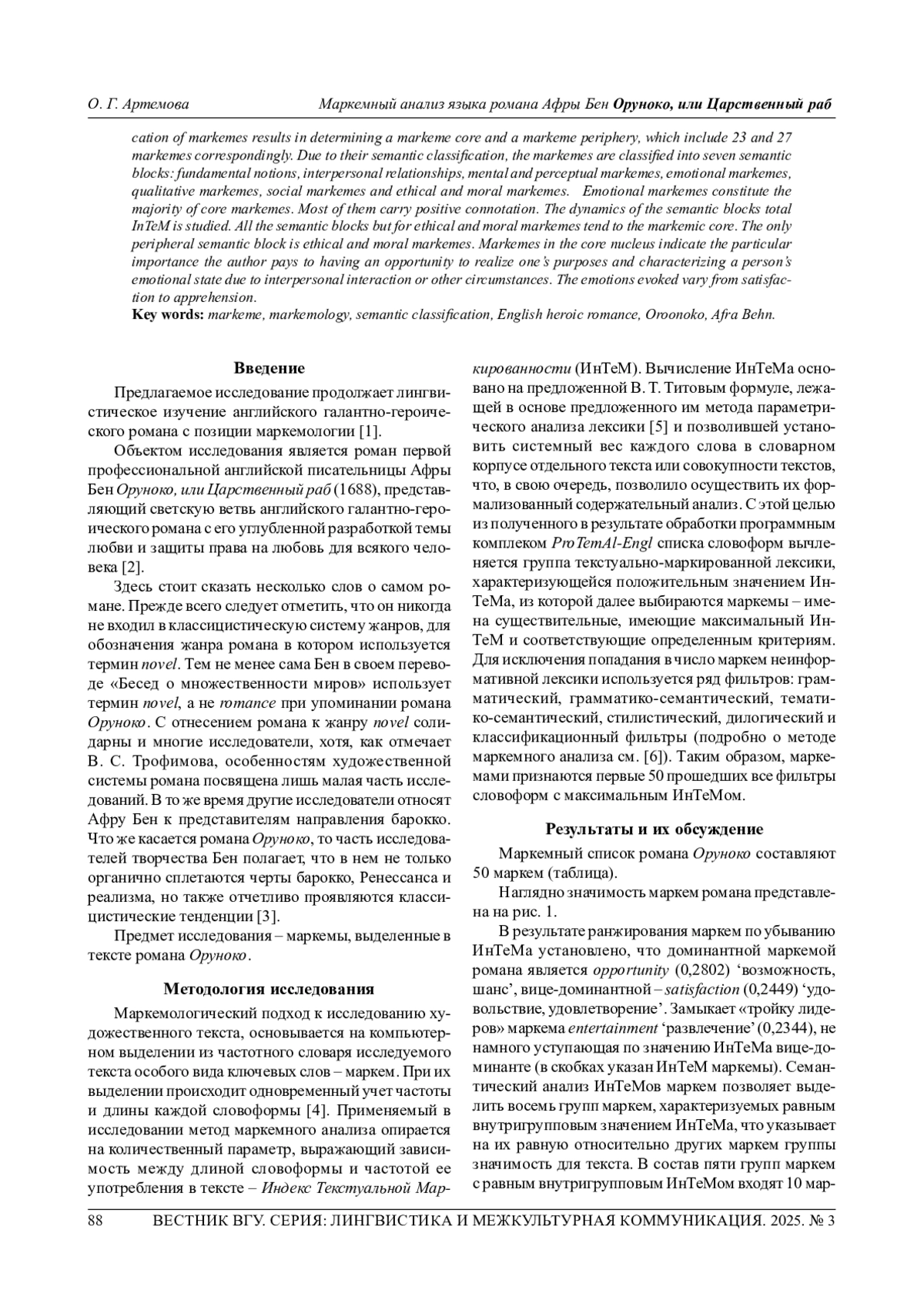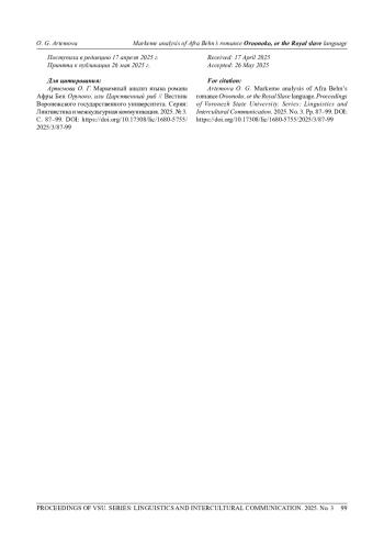 АРТЕМОВА О. Г. МАРКЕМНЫЙ АНАЛИЗ ЯЗЫКА РОМАНА АФРЫ БЕН ОРУНОКО, ИЛИ ЦАРСТВЕННЫЙ РАБ // ВЕСТНИК ВОРОНЕЖСКОГО ГОСУДАРСТВЕННОГО УНИВЕРСИТЕТА. СЕРИЯ: ЛИНГВИСТИКА И МЕЖКУЛЬТУРНАЯ КОММУНИКАЦИЯ. 2025. № 3