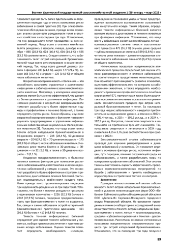 Статья: ЭПИЗООТОЛОГИЧЕСКИЙ АНАЛИЗ ЗАБОЛЕВАЕМОСТИ ТЕЛЯТ ОСТРОЙ КАТАРАЛЬНОЙ БРОНХОПНЕВМОНИЕЙ (2025)