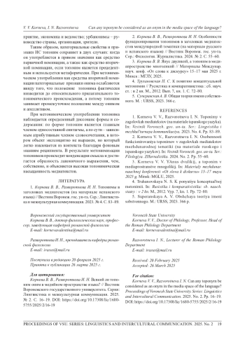 2. Корнева В. В., Разворотнева И. Н. Особенности функционирования топонимов в заголовках медиатекстов международной тематики (на материале русского и испанского языков) // Вестник Воронеж. гос. ун-та. Сер.: Филология. Журналистика. 2024. № 2. C. 55-60.