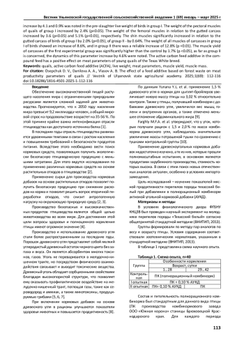 Статья: ВЛИЯНИЕ СКАРМЛИВАНИЯ КОРМОВОЙ ДОБАВКИ НА ОСНОВЕ ОТХОДОВ ЛЕСОЗАГОТОВКИ НА ПОКАЗАТЕЛИ МЯСНОЙ ПРОДУКТИВНОСТИ ПЕРЕПЕЛОВ (2025)