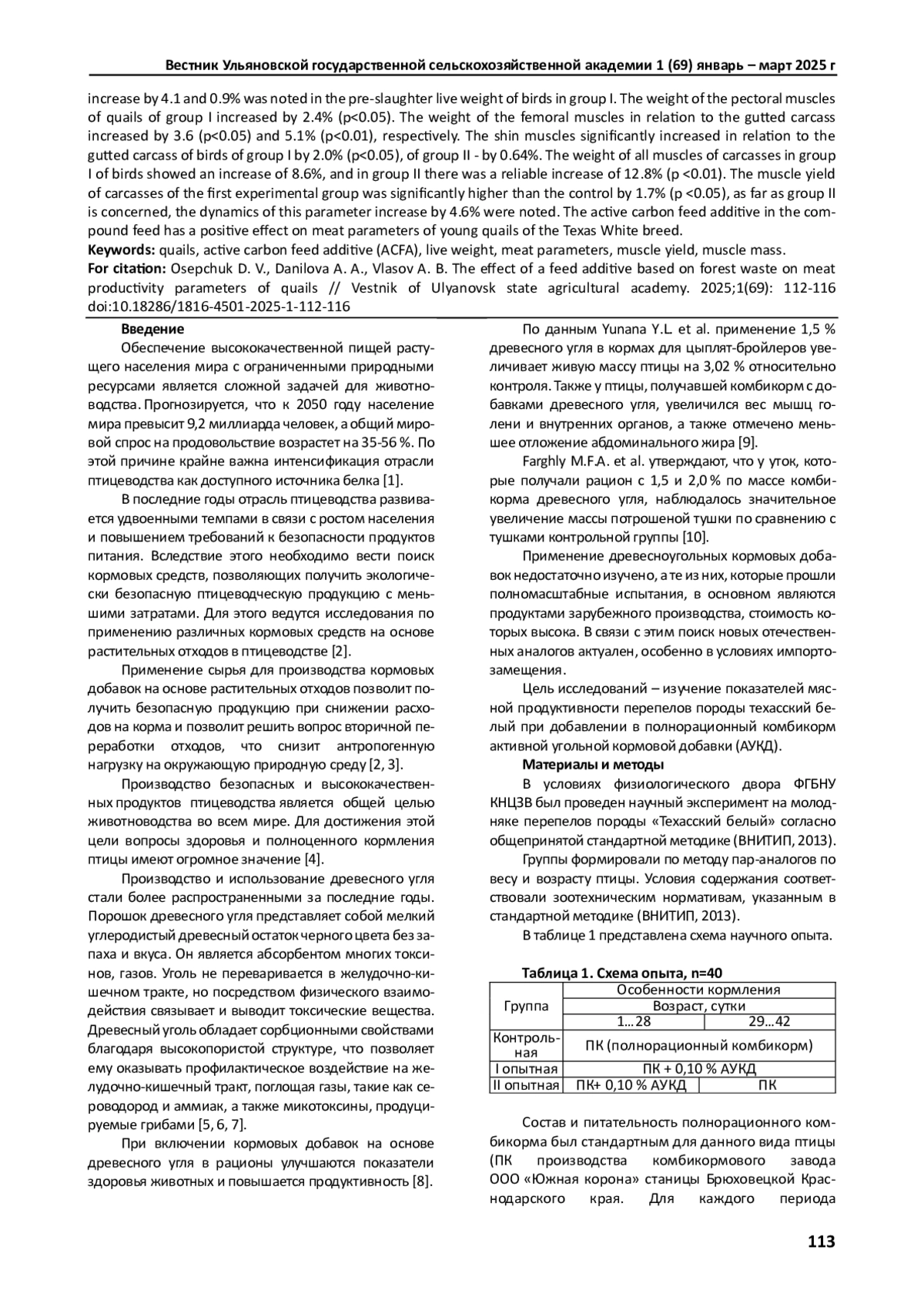 Ключевые фразы: перепела, активная угольная кормовая добавка (аукд), живая масса, мясные показатели, выход мышц, масса мышц