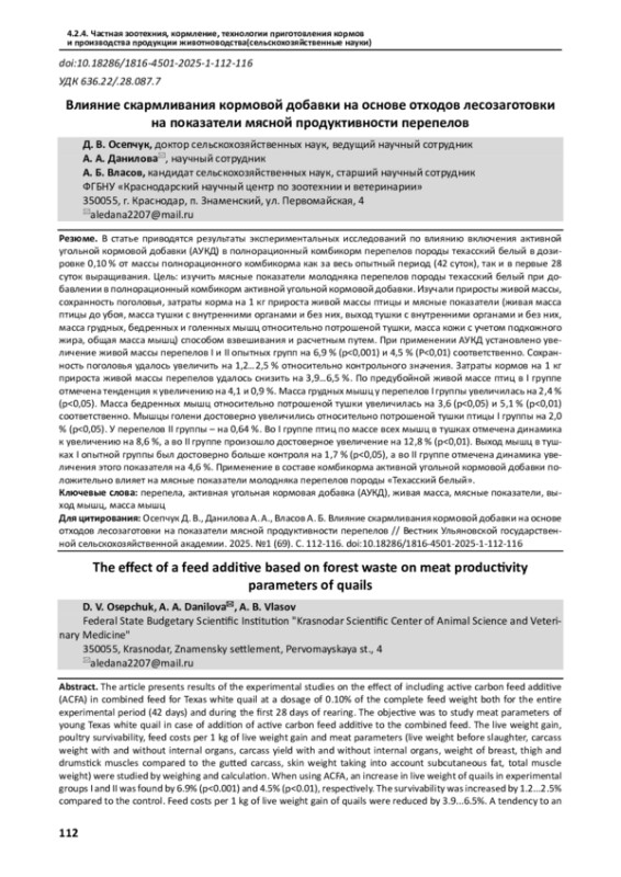 ОСЕПЧУК Д. В., ДАНИЛОВА А. А., ВЛАСОВ А. Б. ВЛИЯНИЕ СКАРМЛИВАНИЯ КОРМОВОЙ ДОБАВКИ НА ОСНОВЕ ОТХОДОВ ЛЕСОЗАГОТОВКИ НА ПОКАЗАТЕЛИ МЯСНОЙ ПРОДУКТИВНОСТИ ПЕРЕПЕЛОВ // ВЕСТНИК УЛЬЯНОВСКОЙ ГОСУДАРСТВЕННОЙ СЕЛЬСКОХОЗЯЙСТВЕННОЙ АКАДЕМИИ. 2025. № 1 (69)