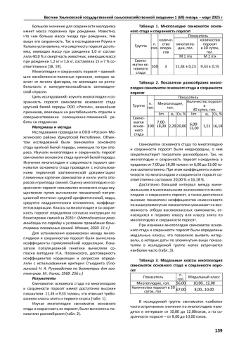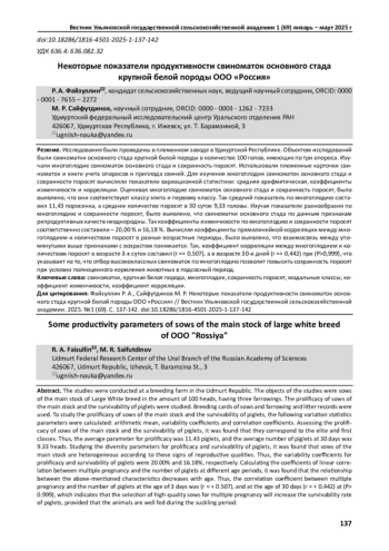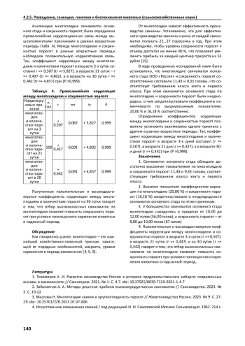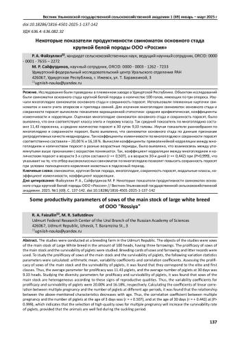 Исследования были проведены в племенном заводе в Удмуртской Республике. Объектом исследований были свиноматки основного стада крупной белой породы в количестве 100 голов, имеющих по три опороса. Изучали многоплодие свиноматок основного стада и сохранность поросят. Использовали племенные карточки свиноматок и книги учета опоросов и приплода свиней. Для изучения многоплодия свиноматок основного стада и сохранности поросят вычисляли показатели вариационной статистики: средняя арифметическая, коэффициенты изменчивости и корреляции. Оценивая многоплодие свиноматок основного стада и сохранность поросят, было выявлено, что они соответствуют классу элита и первому классу. Так средний показатель по многоплодию составил 11,43 поросенка, а среднее количество поросят в 30 суток 9,33 головы. Изучая показатели разнообразия по многоплодию и сохранности поросят, было выявлено, что свиноматки основного стада по данным признакам репродуктивных качеств неоднородны. Так коэффициенты изменчивости по многоплодию и сохранности поросят соответственно составили - 20,00 % и 16,18 %. Вычисляя коэффициенты прямолинейной корреляции между многоплодием и количеством поросят в разные возрастные периоды, было выявлено, что взаимосвязь между упомянутыми выше признаками с возрастом понижается. Так, коэффициент корреляции между многоплодием и количеством поросят в возрасте 3-х суток составил (г =+ 0,507), а в возрасте 30-и дней (г =+ 0,442) при (P>0,999), что указывает на то, что отбор высококлассных свиноматок по многоплодию позволит повысить сохранность поросят при условии полноценного кормления животных в подсосный период.