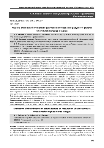 В представленной статье приведены результаты изучения репродуктивных показателей группы самок радужной форели (Oncorhynchus mykiss), состоящей из 100 особей, выращиваемых в садках в Ладожском озере. Целью исследований была оценка репродуктивных показателей самок радужной форели, выращиваемых в садках, и характеристика силы и достоверности влияния абиотических факторов среды на процессы созревания форели в икорно-товарном производстве. Для достижения поставленной цели применяли морфобиологический и дисперсионный анализы. Установили, что созревание рыб зависело от изменений факторов внешней среды, и это влияние имело свои особенности. В начале опытного периода (25 октября 2022 года) был отмечен высокий выход созревших рыб - 92%, а в последующие периоды при снижении всех параметров среды их количество сократилось до 70%, но при этом возросли значения индивидуальных репродуктивных показателей. Так, выход икры от самки составил 195,74±0,46 г или 6,07% в начале и 407,47±19,38 г или 14,11% в конце исследования, что обычно свидетельствует о близком нересте и переходе гонад к завершенной 4-5 стадии зрелости. Оценка достоверного влияния на процессы созревания самок форели абиотических факторов среды (растворенный кислород, длина светового дня и градусодни) показала, что сила влияния каждого из этих факторов на ГСИ составила чуть меньше 50%: 48, 48, 49 соответственно, что свидетельствует о значительном их влиянии при совместном воздействии. Таким образом, увеличение продолжительности выдерживания форели при совместном воздействии абиотических факторов и ее изъятие в более поздние сроки приводит к уменьшению репродуктивных показателей и перезреванию рыбы. В условиях Ладожского озера высокий выход зрелых рыб и оптимальные значения репродуктивных показателей установлены на этапе 3 в январе.